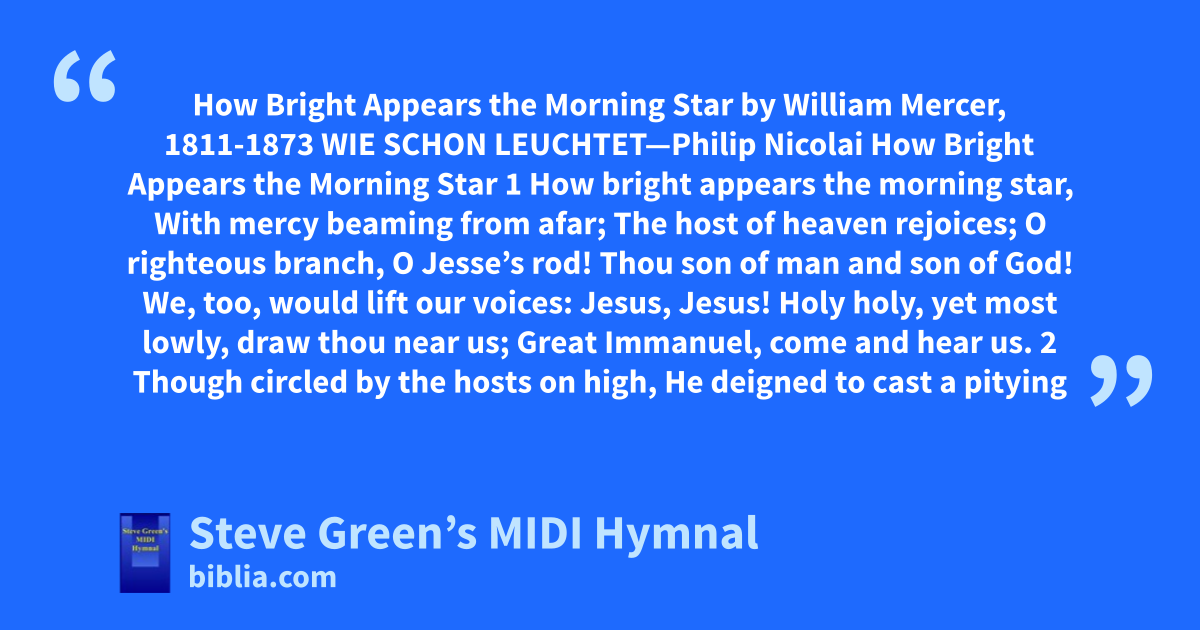 How Bright Appears the Morning Star by William Mercer, 1811-1873 WIE SCHON LEUCHTET—Philip Nicolai How Bright Appears the Morning Star 1 How bright appears the morning star, With mercy beaming from afar; The host of heaven rejoices; O righteous branch, O Jesse’s rod! Thou son of man and son of God! We, too, would lift our voices: Jesus, Jesus! Holy holy, yet most lowly, draw thou near us; Great Immanuel, come and hear us. 2 Though circled by the hosts on high, He deigned to cast a pitying
