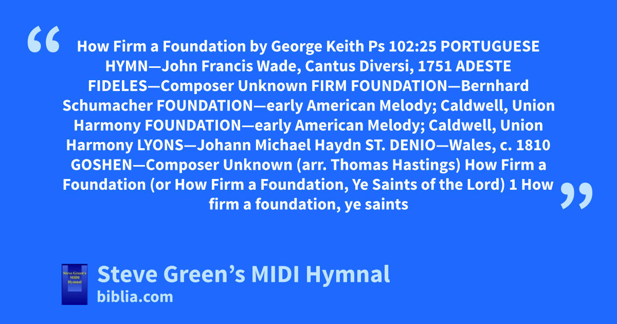How Firm a Foundation by George Keith Ps 102:25 PORTUGUESE HYMN—John Francis Wade, Cantus Diversi, 1751 ADESTE FIDELES—Composer Unknown FIRM FOUNDATION—Bernhard Schumacher FOUNDATION—early American Melody; Caldwell, Union Harmony FOUNDATION—early American Melody; Caldwell, Union Harmony LYONS—Johann Michael Haydn ST. DENIO—Wales, c. 1810 GOSHEN—Composer Unknown (arr. Thomas Hastings) How Firm a Foundation (or How Firm a Foundation, Ye Saints of the Lord) 1 How firm a foundation, ye saints