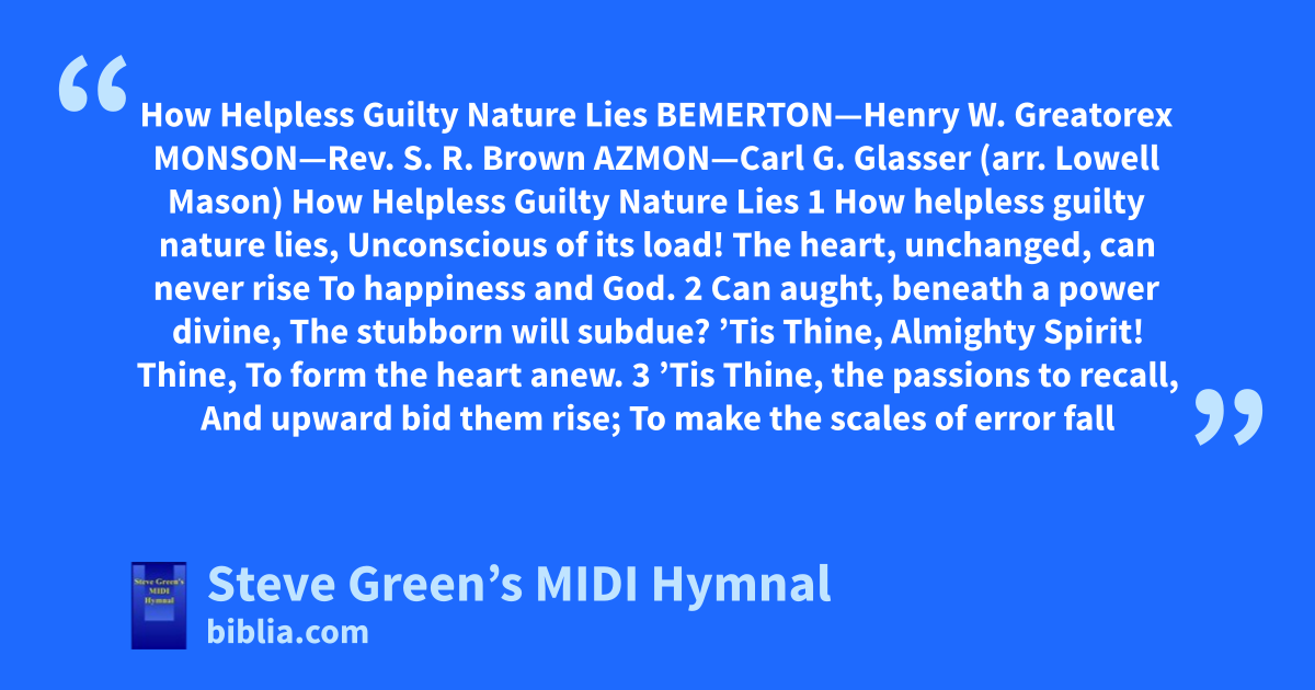 How Helpless Guilty Nature Lies BEMERTON—Henry W. Greatorex MONSON—Rev. S. R. Brown AZMON—Carl G. Glasser (arr. Lowell Mason) How Helpless Guilty Nature Lies 1 How helpless guilty nature lies, Unconscious of its load! The heart, unchanged, can never rise To happiness and God. 2 Can aught, beneath a power divine, The stubborn will subdue? ’Tis Thine, Almighty Spirit! Thine, To form the heart anew. 3 ’Tis Thine, the passions to recall, And upward bid them rise; To make the scales of error fall