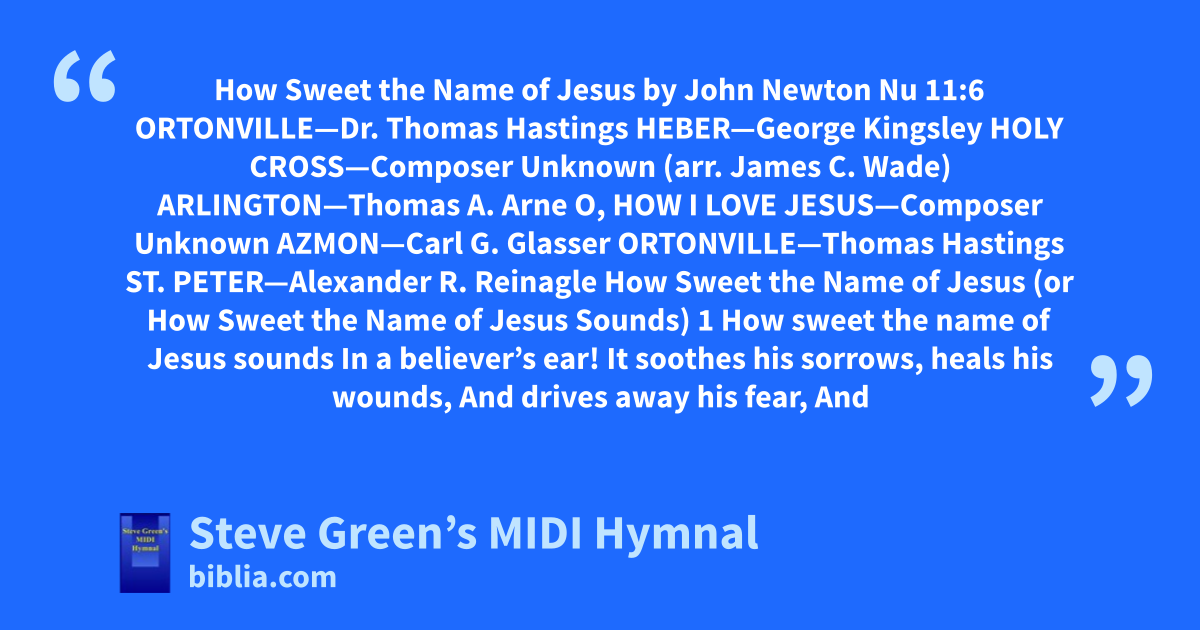 How Sweet the Name of Jesus by John Newton Nu 11:6 ORTONVILLE—Dr. Thomas Hastings HEBER—George Kingsley HOLY CROSS—Composer Unknown (arr. James C. Wade) ARLINGTON—Thomas A. Arne O, HOW I LOVE JESUS—Composer Unknown AZMON—Carl G. Glasser ORTONVILLE—Thomas Hastings ST. PETER—Alexander R. Reinagle How Sweet the Name of Jesus (or How Sweet the Name of Jesus Sounds) 1 How sweet the name of Jesus sounds In a believer’s ear! It soothes his sorrows, heals his wounds, And drives away his fear, And