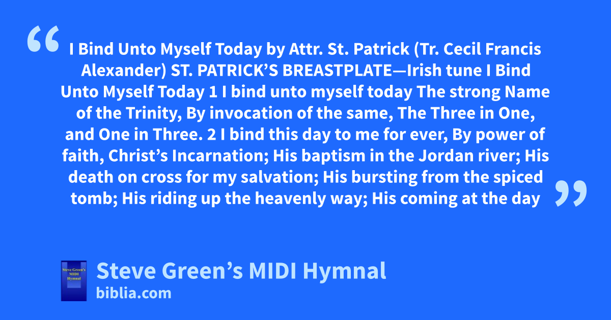 I Bind Unto Myself Today by Attr. St. Patrick (Tr. Cecil Francis Alexander) ST. PATRICK’S BREASTPLATE—Irish tune I Bind Unto Myself Today 1 I bind unto myself today The strong Name of the Trinity, By invocation of the same, The Three in One, and One in Three. 2 I bind this day to me for ever, By power of faith, Christ’s Incarnation; His baptism in the Jordan river; His death on cross for my salvation; His bursting from the spiced tomb; His riding up the heavenly way; His coming at the day