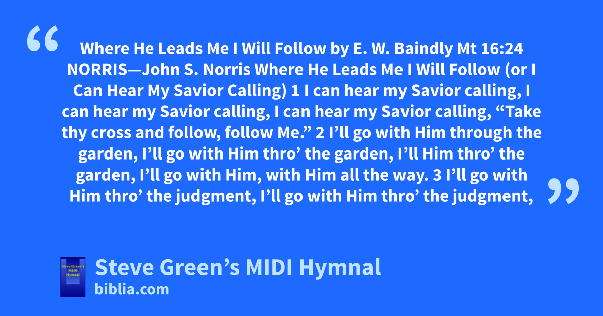 Where He Leads Me I Will Follow by E. W. Baindly Mt 16:24 NORRIS—John S. Norris Where He Leads Me I Will Follow (or I Can Hear My Savior Calling) 1 I can hear my Savior calling, I can hear my Savior calling, I can hear my Savior calling, “Take thy cross and follow, follow Me.” 2 I’ll go with Him through the garden, I’ll go with Him thro’ the garden, I’ll Him thro’ the garden, I’ll go with Him, with Him all the way. 3 I’ll go with Him thro’ the judgment, I’ll go with Him thro’ the judgment,