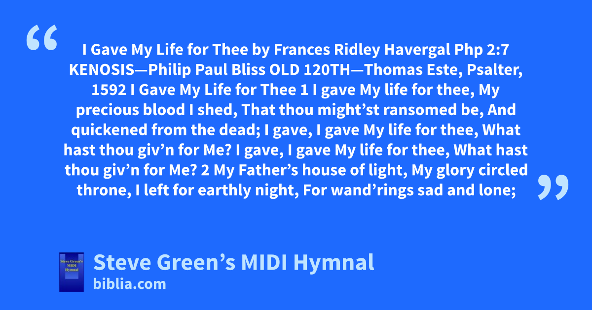 I Gave My Life for Thee by Frances Ridley Havergal Php 2:7 KENOSIS—Philip Paul Bliss OLD 120TH—Thomas Este, Psalter, 1592 I Gave My Life for Thee 1 I gave My life for thee, My precious blood I shed, That thou might’st ransomed be, And quickened from the dead; I gave, I gave My life for thee, What hast thou giv’n for Me? I gave, I gave My life for thee, What hast thou giv’n for Me? 2 My Father’s house of light, My glory circled throne, I left for earthly night, For wand’rings sad and lone;