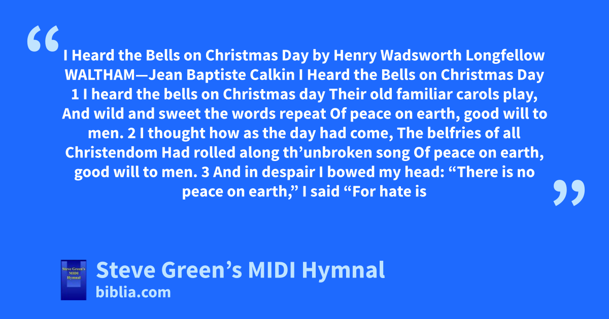 I Heard the Bells on Christmas Day by Henry Wadsworth Longfellow WALTHAM—Jean Baptiste Calkin I Heard the Bells on Christmas Day 1 I heard the bells on Christmas day Their old familiar carols play, And wild and sweet the words repeat Of peace on earth, good will to men. 2 I thought how as the day had come, The belfries of all Christendom Had rolled along th’unbroken song Of peace on earth, good will to men. 3 And in despair I bowed my head: “There is no peace on earth,” I said “For hate is