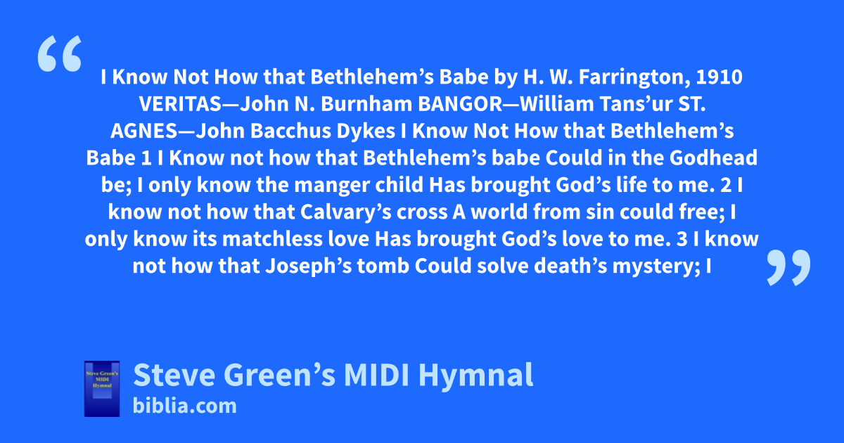 I Know Not How that Bethlehem’s Babe by H. W. Farrington, 1910 VERITAS—John N. Burnham BANGOR—William Tans’ur ST. AGNES—John Bacchus Dykes I Know Not How that Bethlehem’s Babe 1 I Know not how that Bethlehem’s babe Could in the Godhead be; I only know the manger child Has brought God’s life to me. 2 I know not how that Calvary’s cross A world from sin could free; I only know its matchless love Has brought God’s love to me. 3 I know not how that Joseph’s tomb Could solve death’s mystery; I