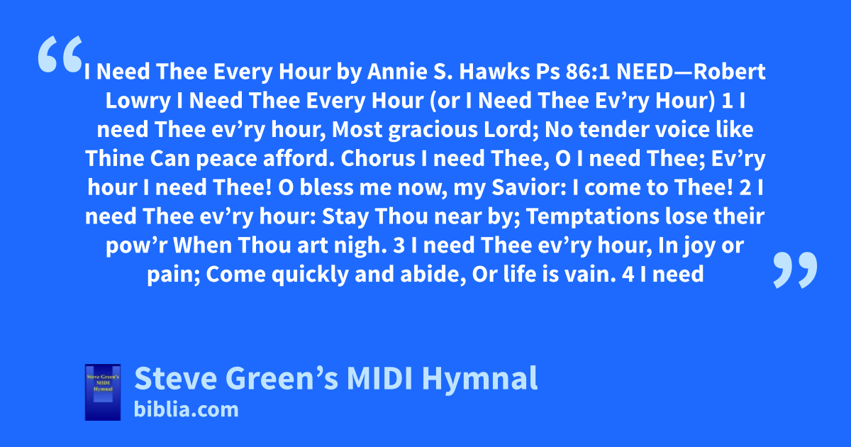 I Need Thee Every Hour by Annie S. Hawks Ps 86:1 NEED—Robert Lowry I Need Thee Every Hour (or I Need Thee Ev’ry Hour) 1 I need Thee ev’ry hour, Most gracious Lord; No tender voice like Thine Can peace afford. Chorus I need Thee, O I need Thee; Ev’ry hour I need Thee! O bless me now, my Savior: I come to Thee! 2 I need Thee ev’ry hour: Stay Thou near by; Temptations lose their pow’r When Thou art nigh. 3 I need Thee ev’ry hour, In joy or pain; Come quickly and abide, Or life is vain. 4 I need