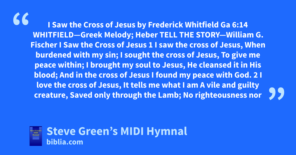 I Saw the Cross of Jesus by Frederick Whitfield Ga 6:14 WHITFIELD—Greek Melody; Heber TELL THE STORY—William G. Fischer I Saw the Cross of Jesus 1 I saw the cross of Jesus, When burdened with my sin; I sought the cross of Jesus, To give me peace within; I brought my soul to Jesus, He cleansed it in His blood; And in the cross of Jesus I found my peace with God. 2 I love the cross of Jesus, It tells me what I am A vile and guilty creature, Saved only through the Lamb; No righteousness nor