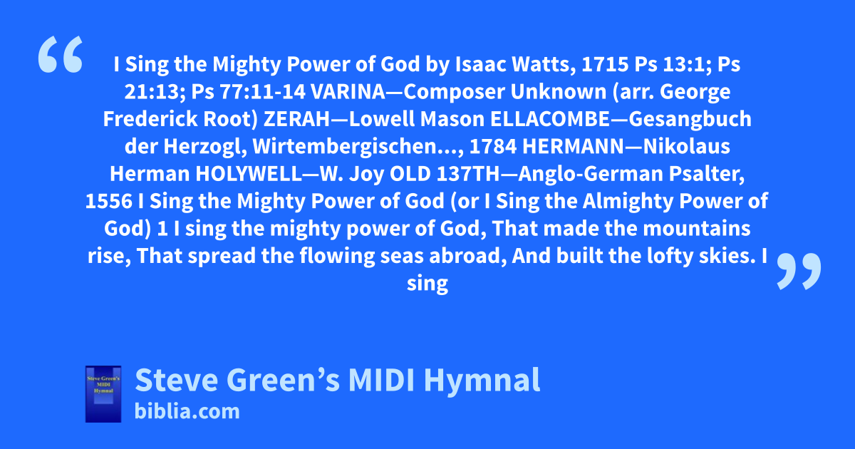 I Sing the Mighty Power of God by Isaac Watts, 1715 Ps 13:1; Ps 21:13; Ps 77:11-14 VARINA—Composer Unknown (arr. George Frederick Root) ZERAH—Lowell Mason ELLACOMBE—Gesangbuch der Herzogl, Wirtembergischen..., 1784 HERMANN—Nikolaus Herman HOLYWELL—W. Joy OLD 137TH—Anglo-German Psalter, 1556 I Sing the Mighty Power of God (or I Sing the Almighty Power of God) 1 I sing the mighty power of God, That made the mountains rise, That spread the flowing seas abroad, And built the lofty skies. I sing