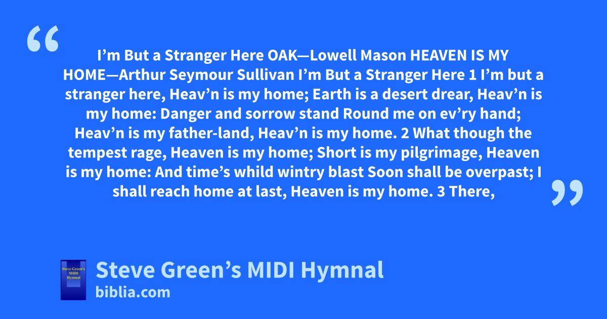 I’m But a Stranger Here OAK—Lowell Mason HEAVEN IS MY HOME—Arthur Seymour Sullivan I’m But a Stranger Here 1 I’m but a stranger here, Heav’n is my home; Earth is a desert drear, Heav’n is my home: Danger and sorrow stand Round me on ev’ry hand; Heav’n is my father-land, Heav’n is my home. 2 What though the tempest rage, Heaven is my home; Short is my pilgrimage, Heaven is my home: And time’s whild wintry blast Soon shall be overpast; I shall reach home at last, Heaven is my home. 3 There,
