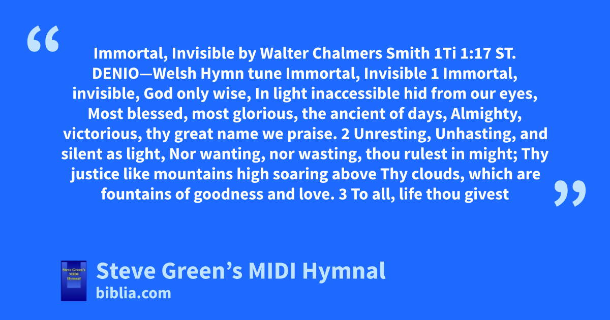Immortal, Invisible by Walter Chalmers Smith 1Ti 1:17 ST. DENIO—Welsh Hymn tune Immortal, Invisible 1 Immortal, invisible, God only wise, In light inaccessible hid from our eyes, Most blessed, most glorious, the ancient of days, Almighty, victorious, thy great name we praise. 2 Unresting, Unhasting, and silent as light, Nor wanting, nor wasting, thou rulest in might; Thy justice like mountains high soaring above Thy clouds, which are fountains of goodness and love. 3 To all, life thou givest