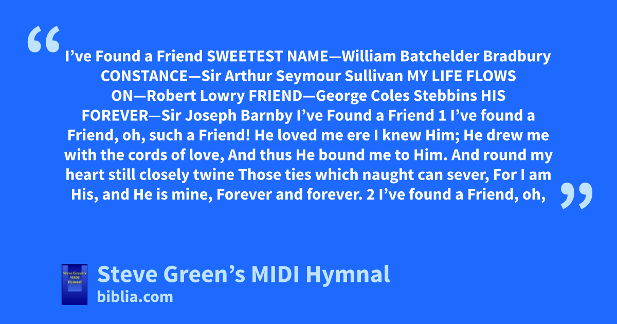 I’ve Found a Friend SWEETEST NAME—William Batchelder Bradbury CONSTANCE—Sir Arthur Seymour Sullivan MY LIFE FLOWS ON—Robert Lowry FRIEND—George Coles Stebbins HIS FOREVER—Sir Joseph Barnby I’ve Found a Friend 1 I’ve found a Friend, oh, such a Friend! He loved me ere I knew Him; He drew me with the cords of love, And thus He bound me to Him. And round my heart still closely twine Those ties which naught can sever, For I am His, and He is mine, Forever and forever. 2 I’ve found a Friend, oh,
