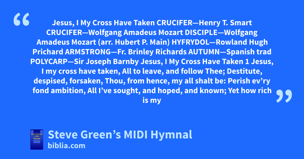 Jesus, I My Cross Have Taken CRUCIFER—Henry T. Smart CRUCIFER—Wolfgang Amadeus Mozart DISCIPLE—Wolfgang Amadeus Mozart (arr. Hubert P. Main) HYFRYDOL—Rowland Hugh Prichard ARMSTRONG—Fr. Brinley Richards AUTUMN—Spanish trad POLYCARP—Sir Joseph Barnby Jesus, I My Cross Have Taken 1 Jesus, I my cross have taken, All to leave, and follow Thee; Destitute, despised, forsaken, Thou, from hence, my all shalt be: Perish ev’ry fond ambition, All I’ve sought, and hoped, and known; Yet how rich is my