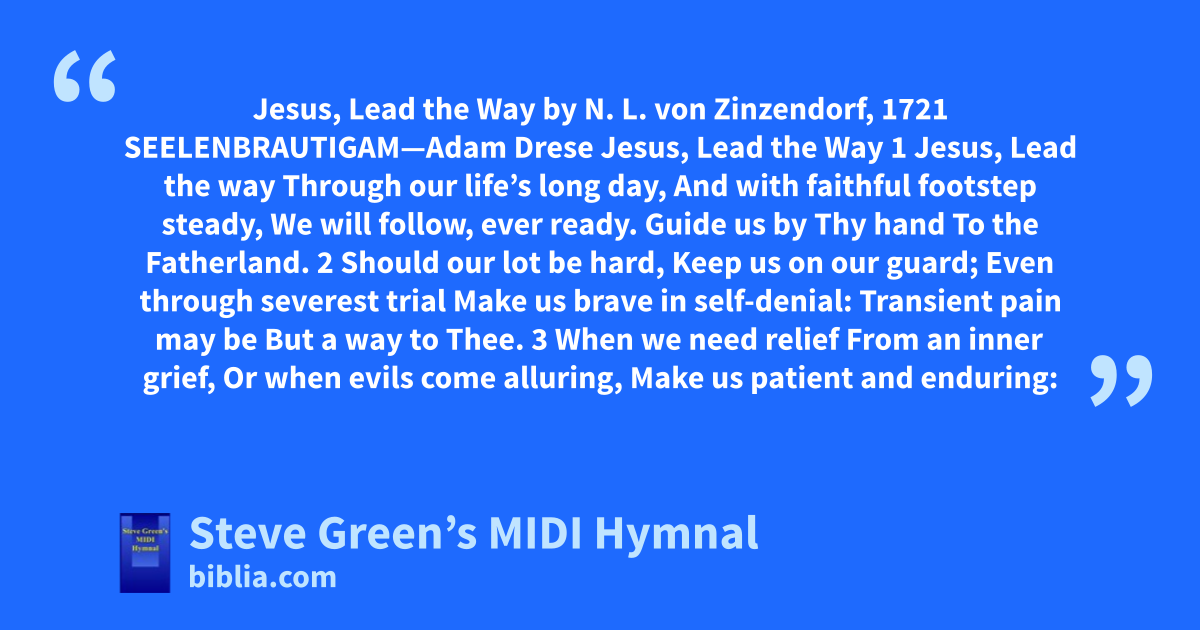 Jesus, Lead the Way by N. L. von Zinzendorf, 1721 SEELENBRAUTIGAM—Adam Drese Jesus, Lead the Way 1 Jesus, Lead the way Through our life’s long day, And with faithful footstep steady, We will follow, ever ready. Guide us by Thy hand To the Fatherland. 2 Should our lot be hard, Keep us on our guard; Even through severest trial Make us brave in self-denial: Transient pain may be But a way to Thee. 3 When we need relief From an inner grief, Or when evils come alluring, Make us patient and enduring:
