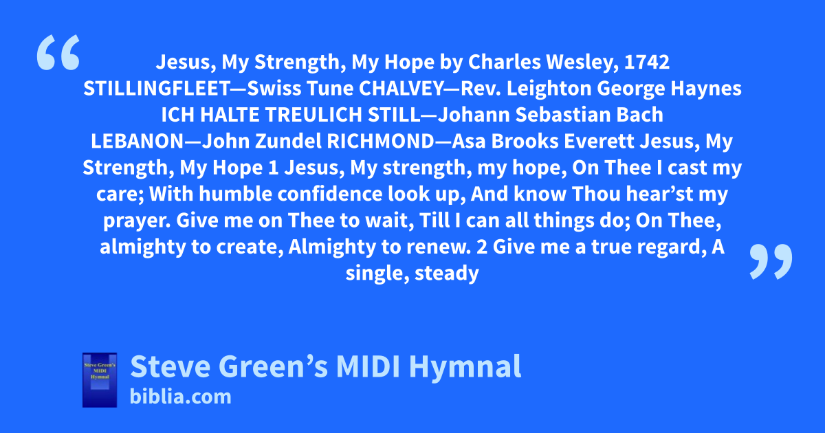 Jesus, My Strength, My Hope by Charles Wesley, 1742 STILLINGFLEET—Swiss Tune CHALVEY—Rev. Leighton George Haynes ICH HALTE TREULICH STILL—Johann Sebastian Bach LEBANON—John Zundel RICHMOND—Asa Brooks Everett Jesus, My Strength, My Hope 1 Jesus, My strength, my hope, On Thee I cast my care; With humble confidence look up, And know Thou hear’st my prayer. Give me on Thee to wait, Till I can all things do; On Thee, almighty to create, Almighty to renew. 2 Give me a true regard, A single, steady