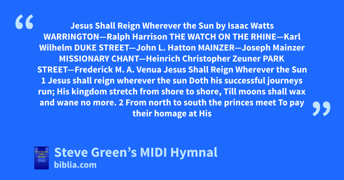 Jesus Shall Reign Wherever the Sun by Isaac Watts WARRINGTON—Ralph Harrison THE WATCH ON THE RHINE—Karl Wilhelm DUKE STREET—John L. Hatton MAINZER—Joseph Mainzer MISSIONARY CHANT—Heinrich Christopher Zeuner PARK STREET—Frederick M. A. Venua Jesus Shall Reign Wherever the Sun 1 Jesus shall reign wherever the sun Doth his successful journeys run; His kingdom stretch from shore to shore, Till moons shall wax and wane no more. 2 From north to south the princes meet To pay their homage at His