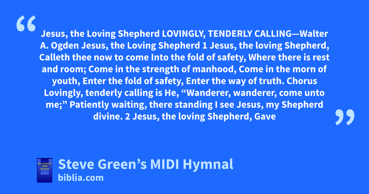 Jesus, the Loving Shepherd LOVINGLY, TENDERLY CALLING—Walter A. Ogden Jesus, the Loving Shepherd 1 Jesus, the loving Shepherd, Calleth thee now to come Into the fold of safety, Where there is rest and room; Come in the strength of manhood, Come in the morn of youth, Enter the fold of safety, Enter the way of truth. Chorus Lovingly, tenderly calling is He, “Wanderer, wanderer, come unto me;” Patiently waiting, there standing I see Jesus, my Shepherd divine. 2 Jesus, the loving Shepherd, Gave