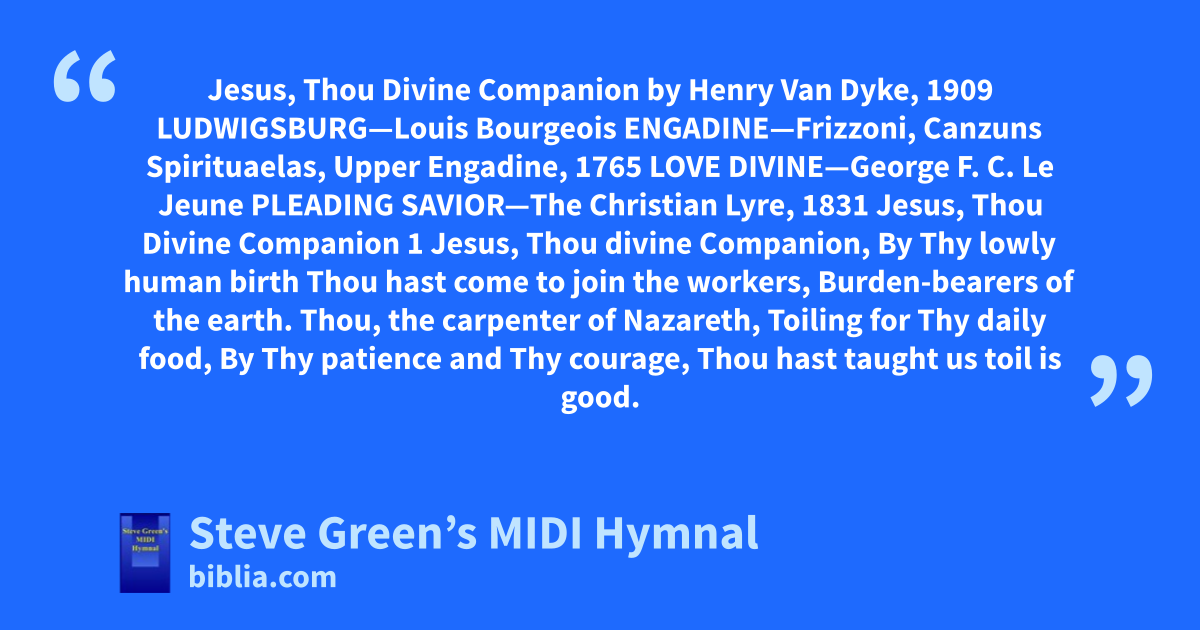 Jesus, Thou Divine Companion by Henry Van Dyke, 1909 LUDWIGSBURG—Louis Bourgeois ENGADINE—Frizzoni, Canzuns Spirituaelas, Upper Engadine, 1765 LOVE DIVINE—George F. C. Le Jeune PLEADING SAVIOR—The Christian Lyre, 1831 Jesus, Thou Divine Companion 1 Jesus, Thou divine Companion, By Thy lowly human birth Thou hast come to join the workers, Burden-bearers of the earth. Thou, the carpenter of Nazareth, Toiling for Thy daily food, By Thy patience and Thy courage, Thou hast taught us toil is good.