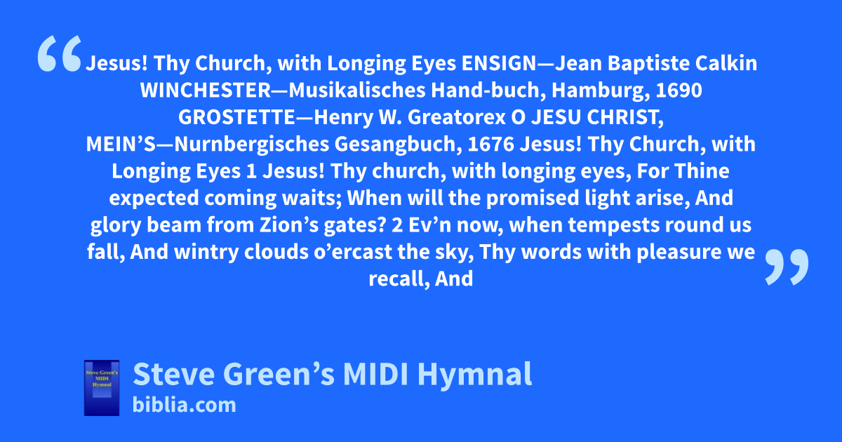 Jesus! Thy Church, with Longing Eyes ENSIGN—Jean Baptiste Calkin WINCHESTER—Musikalisches Hand-buch, Hamburg, 1690 GROSTETTE—Henry W. Greatorex O JESU CHRIST, MEIN’S—Nurnbergisches Gesangbuch, 1676 Jesus! Thy Church, with Longing Eyes 1 Jesus! Thy church, with longing eyes, For Thine expected coming waits; When will the promised light arise, And glory beam from Zion’s gates? 2 Ev’n now, when tempests round us fall, And wintry clouds o’ercast the sky, Thy words with pleasure we recall, And