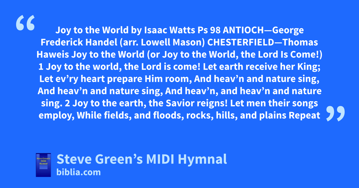 Joy to the World by Isaac Watts Ps 98 ANTIOCH—George Frederick Handel (arr. Lowell Mason) CHESTERFIELD—Thomas Haweis Joy to the World (or Joy to the World, the Lord Is Come!) 1 Joy to the world, the Lord is come! Let earth receive her King; Let ev’ry heart prepare Him room, And heav’n and nature sing, And heav’n and nature sing, And heav’n, and heav’n and nature sing. 2 Joy to the earth, the Savior reigns! Let men their songs employ, While fields, and floods, rocks, hills, and plains Repeat