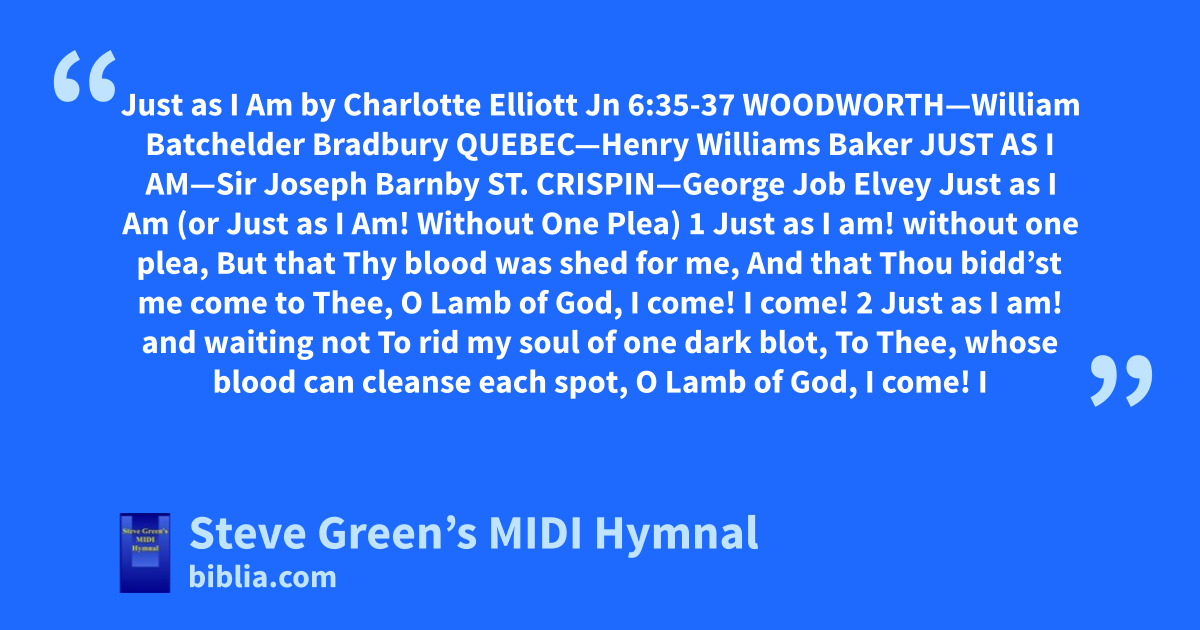 Just as I Am by Charlotte Elliott Jn 6:35-37 WOODWORTH—William Batchelder Bradbury QUEBEC—Henry Williams Baker JUST AS I AM—Sir Joseph Barnby ST. CRISPIN—George Job Elvey Just as I Am (or Just as I Am! Without One Plea) 1 Just as I am! without one plea, But that Thy blood was shed for me, And that Thou bidd’st me come to Thee, O Lamb of God, I come! I come! 2 Just as I am! and waiting not To rid my soul of one dark blot, To Thee, whose blood can cleanse each spot, O Lamb of God, I come! I