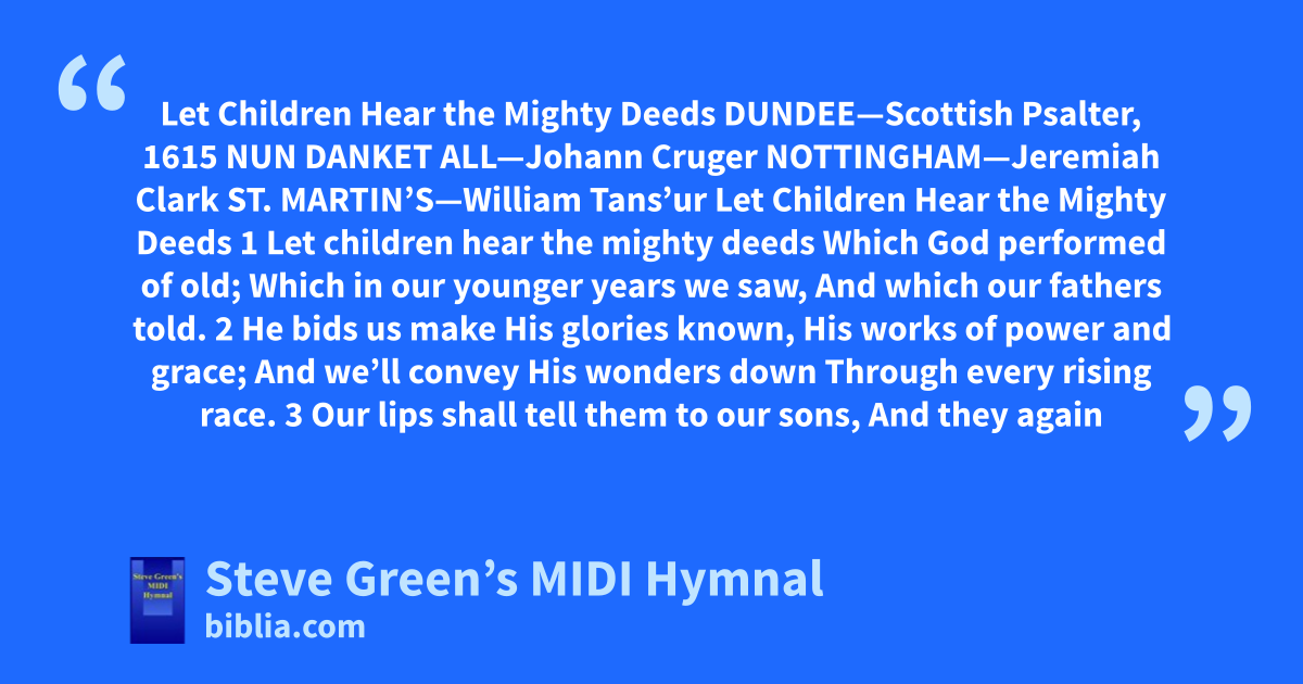 Let Children Hear the Mighty Deeds DUNDEE—Scottish Psalter, 1615 NUN DANKET ALL—Johann Cruger NOTTINGHAM—Jeremiah Clark ST. MARTIN’S—William Tans’ur Let Children Hear the Mighty Deeds 1 Let children hear the mighty deeds Which God performed of old; Which in our younger years we saw, And which our fathers told. 2 He bids us make His glories known, His works of power and grace; And we’ll convey His wonders down Through every rising race. 3 Our lips shall tell them to our sons, And they again