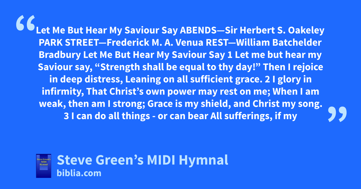 Let Me But Hear My Saviour Say ABENDS—Sir Herbert S. Oakeley PARK STREET—Frederick M. A. Venua REST—William Batchelder Bradbury Let Me But Hear My Saviour Say 1 Let me but hear my Saviour say, “Strength shall be equal to thy day!” Then I rejoice in deep distress, Leaning on all sufficient grace. 2 I glory in infirmity, That Christ’s own power may rest on me; When I am weak, then am I strong; Grace is my shield, and Christ my song. 3 I can do all things - or can bear All sufferings, if my