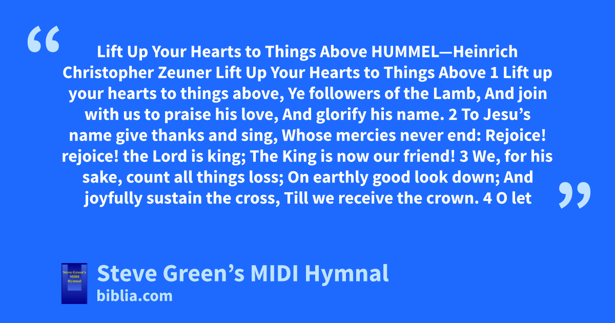 Lift Up Your Hearts to Things Above HUMMEL—Heinrich Christopher Zeuner Lift Up Your Hearts to Things Above 1 Lift up your hearts to things above, Ye followers of the Lamb, And join with us to praise his love, And glorify his name. 2 To Jesu’s name give thanks and sing, Whose mercies never end: Rejoice! rejoice! the Lord is king; The King is now our friend! 3 We, for his sake, count all things loss; On earthly good look down; And joyfully sustain the cross, Till we receive the crown. 4 O let