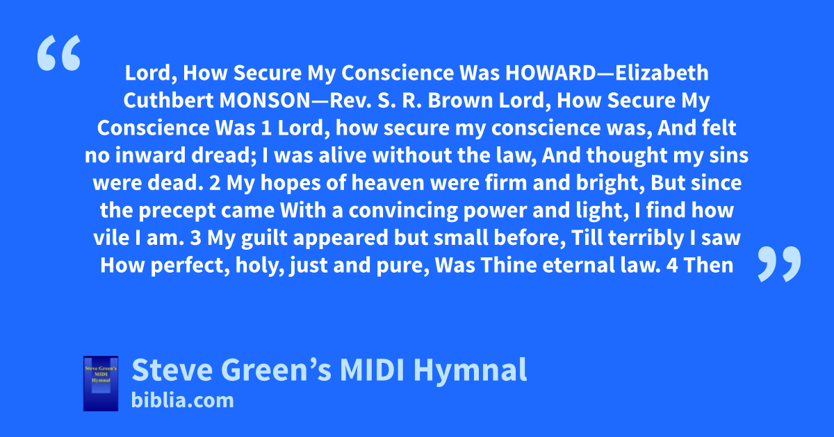 Lord, How Secure My Conscience Was HOWARD—Elizabeth Cuthbert MONSON—Rev. S. R. Brown Lord, How Secure My Conscience Was 1 Lord, how secure my conscience was, And felt no inward dread; I was alive without the law, And thought my sins were dead. 2 My hopes of heaven were firm and bright, But since the precept came With a convincing power and light, I find how vile I am. 3 My guilt appeared but small before, Till terribly I saw How perfect, holy, just and pure, Was Thine eternal law. 4 Then