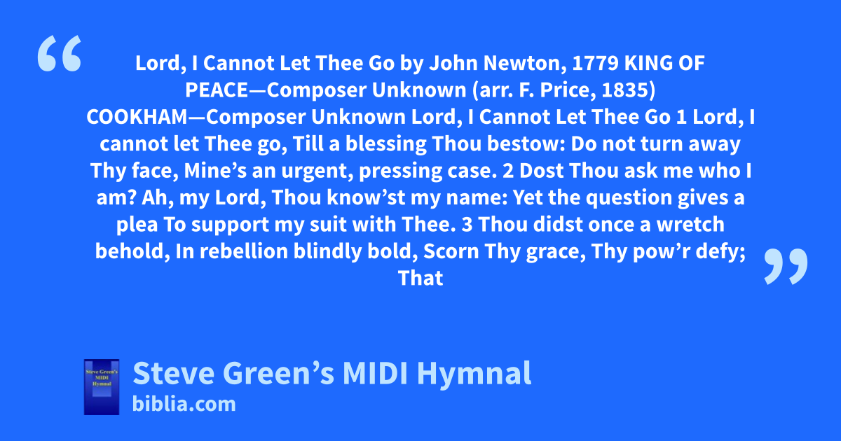 Lord, I Cannot Let Thee Go by John Newton, 1779 KING OF PEACE—Composer Unknown (arr. F. Price, 1835) COOKHAM—Composer Unknown Lord, I Cannot Let Thee Go 1 Lord, I cannot let Thee go, Till a blessing Thou bestow: Do not turn away Thy face, Mine’s an urgent, pressing case. 2 Dost Thou ask me who I am? Ah, my Lord, Thou know’st my name: Yet the question gives a plea To support my suit with Thee. 3 Thou didst once a wretch behold, In rebellion blindly bold, Scorn Thy grace, Thy pow’r defy; That
