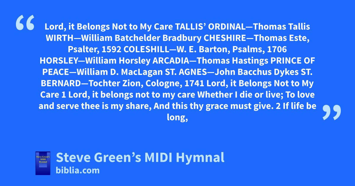 Lord, it Belongs Not to My Care TALLIS’ ORDINAL—Thomas Tallis WIRTH—William Batchelder Bradbury CHESHIRE—Thomas Este, Psalter, 1592 COLESHILL—W. E. Barton, Psalms, 1706 HORSLEY—William Horsley ARCADIA—Thomas Hastings PRINCE OF PEACE—William D. MacLagan ST. AGNES—John Bacchus Dykes ST. BERNARD—Tochter Zion, Cologne, 1741 Lord, it Belongs Not to My Care 1 Lord, it belongs not to my care Whether I die or live; To love and serve thee is my share, And this thy grace must give. 2 If life be long,