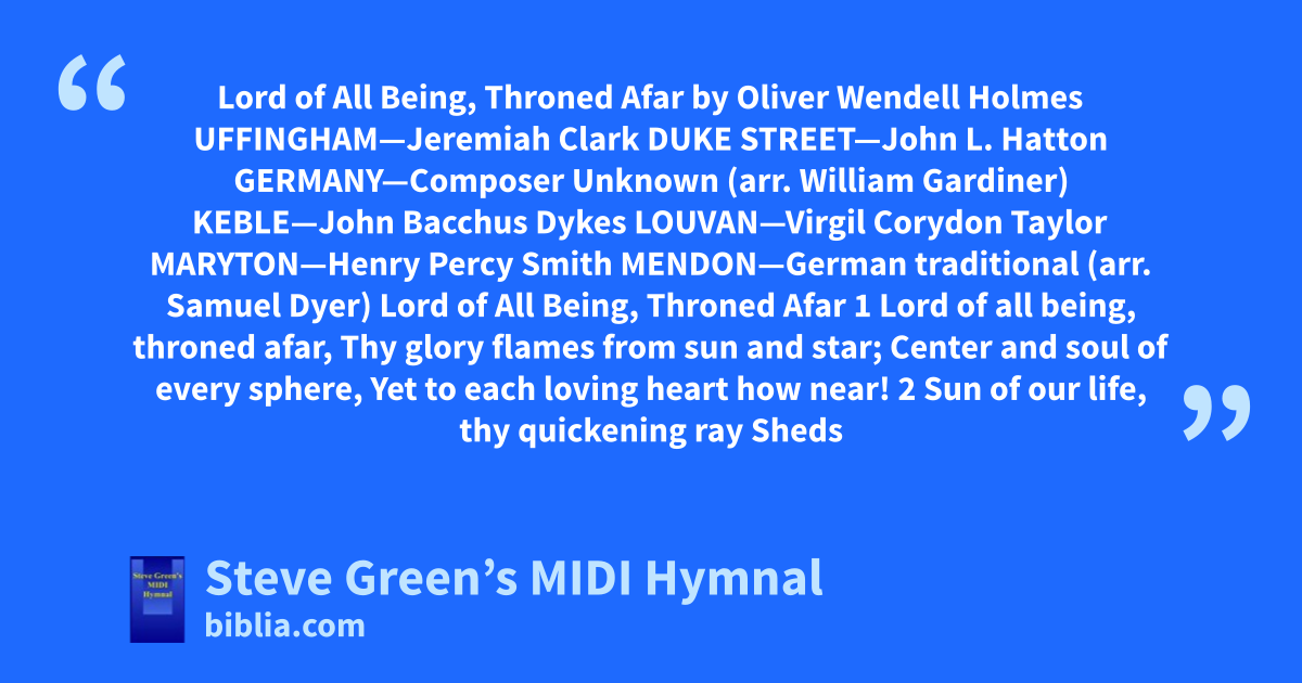 Lord of All Being, Throned Afar by Oliver Wendell Holmes UFFINGHAM—Jeremiah Clark DUKE STREET—John L. Hatton GERMANY—Composer Unknown (arr. William Gardiner) KEBLE—John Bacchus Dykes LOUVAN—Virgil Corydon Taylor MARYTON—Henry Percy Smith MENDON—German traditional (arr. Samuel Dyer) Lord of All Being, Throned Afar 1 Lord of all being, throned afar, Thy glory flames from sun and star; Center and soul of every sphere, Yet to each loving heart how near! 2 Sun of our life, thy quickening ray Sheds