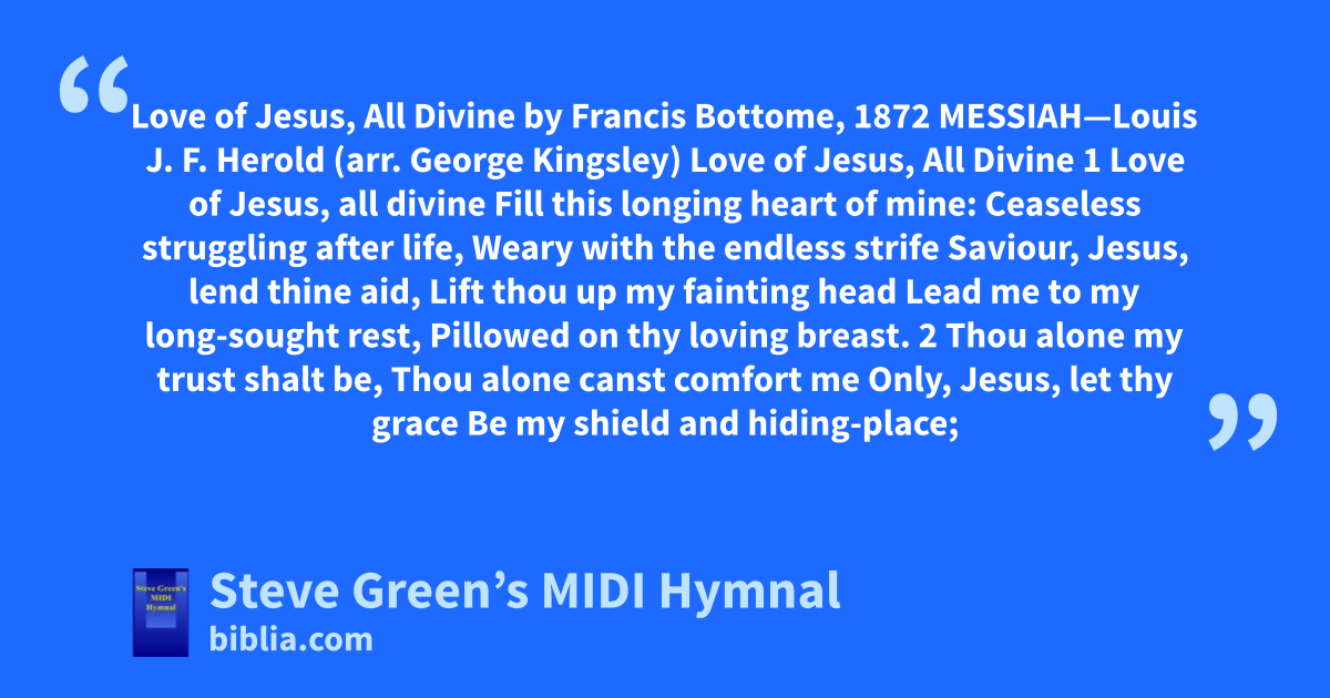 Love of Jesus, All Divine by Francis Bottome, 1872 MESSIAH—Louis J. F. Herold (arr. George Kingsley) Love of Jesus, All Divine 1 Love of Jesus, all divine Fill this longing heart of mine: Ceaseless struggling after life, Weary with the endless strife Saviour, Jesus, lend thine aid, Lift thou up my fainting head Lead me to my long-sought rest, Pillowed on thy loving breast. 2 Thou alone my trust shalt be, Thou alone canst comfort me Only, Jesus, let thy grace Be my shield and hiding-place;