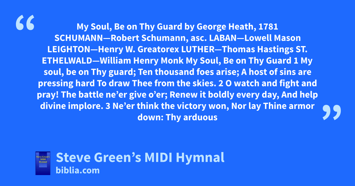My Soul, Be on Thy Guard by George Heath, 1781 SCHUMANN—Robert Schumann, asc. LABAN—Lowell Mason LEIGHTON—Henry W. Greatorex LUTHER—Thomas Hastings ST. ETHELWALD—William Henry Monk My Soul, Be on Thy Guard 1 My soul, be on Thy guard; Ten thousand foes arise; A host of sins are pressing hard To draw Thee from the skies. 2 O watch and fight and pray! The battle ne’er give o’er; Renew it boldly every day, And help divine implore. 3 Ne’er think the victory won, Nor lay Thine armor down: Thy arduous