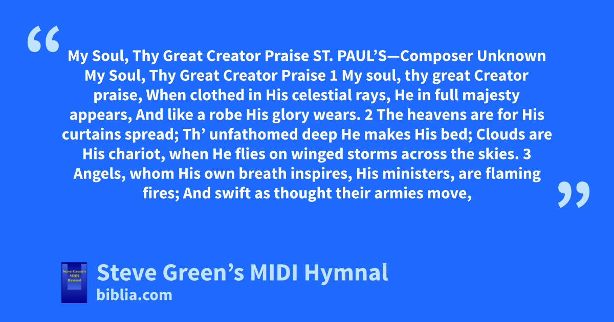 My Soul, Thy Great Creator Praise ST. PAUL’S—Composer Unknown My Soul, Thy Great Creator Praise 1 My soul, thy great Creator praise, When clothed in His celestial rays, He in full majesty appears, And like a robe His glory wears. 2 The heavens are for His curtains spread; Th’ unfathomed deep He makes His bed; Clouds are His chariot, when He flies on winged storms across the skies. 3 Angels, whom His own breath inspires, His ministers, are flaming fires; And swift as thought their armies move,