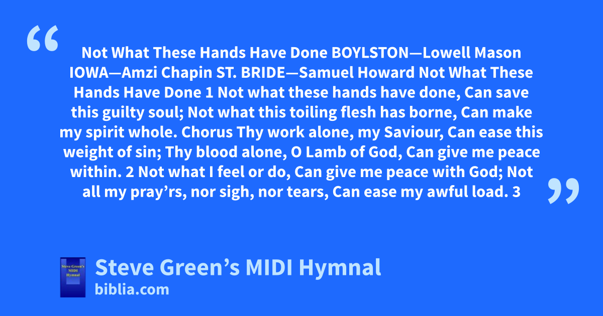 Not What These Hands Have Done BOYLSTON—Lowell Mason IOWA—Amzi Chapin ST. BRIDE—Samuel Howard Not What These Hands Have Done 1 Not what these hands have done, Can save this guilty soul; Not what this toiling flesh has borne, Can make my spirit whole. Chorus Thy work alone, my Saviour, Can ease this weight of sin; Thy blood alone, O Lamb of God, Can give me peace within. 2 Not what I feel or do, Can give me peace with God; Not all my pray’rs, nor sigh, nor tears, Can ease my awful load. 3