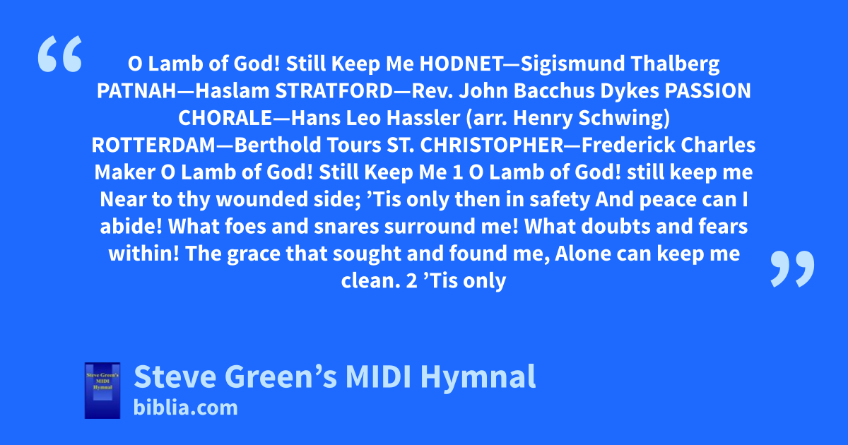 O Lamb of God! Still Keep Me HODNET—Sigismund Thalberg PATNAH—Haslam STRATFORD—Rev. John Bacchus Dykes PASSION CHORALE—Hans Leo Hassler (arr. Henry Schwing) ROTTERDAM—Berthold Tours ST. CHRISTOPHER—Frederick Charles Maker O Lamb of God! Still Keep Me 1 O Lamb of God! still keep me Near to thy wounded side; ’Tis only then in safety And peace can I abide! What foes and snares surround me! What doubts and fears within! The grace that sought and found me, Alone can keep me clean. 2 ’Tis only