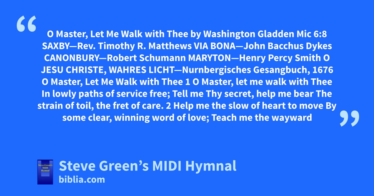 O Master, Let Me Walk with Thee by Washington Gladden Mic 6:8 SAXBY—Rev. Timothy R. Matthews VIA BONA—John Bacchus Dykes CANONBURY—Robert Schumann MARYTON—Henry Percy Smith O JESU CHRISTE, WAHRES LICHT—Nurnbergisches Gesangbuch, 1676 O Master, Let Me Walk with Thee 1 O Master, let me walk with Thee In lowly paths of service free; Tell me Thy secret, help me bear The strain of toil, the fret of care. 2 Help me the slow of heart to move By some clear, winning word of love; Teach me the wayward