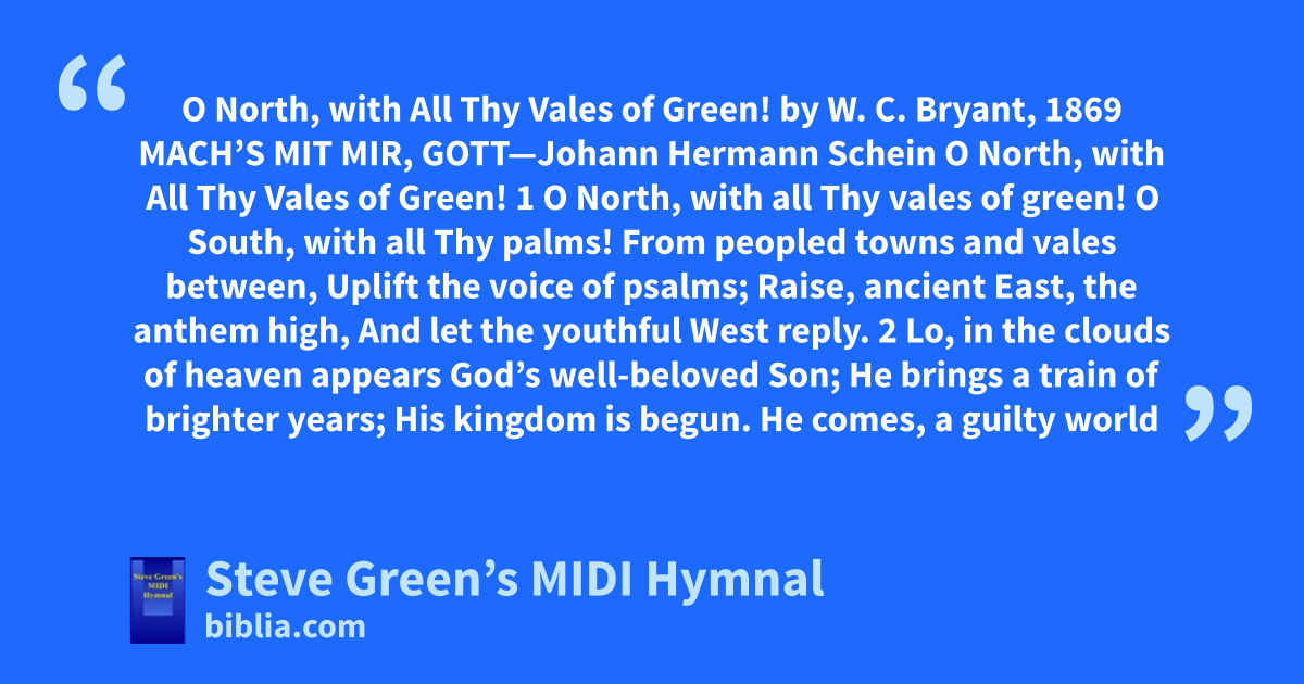 O North, with All Thy Vales of Green! by W. C. Bryant, 1869 MACH’S MIT MIR, GOTT—Johann Hermann Schein O North, with All Thy Vales of Green! 1 O North, with all Thy vales of green! O South, with all Thy palms! From peopled towns and vales between, Uplift the voice of psalms; Raise, ancient East, the anthem high, And let the youthful West reply. 2 Lo, in the clouds of heaven appears God’s well-beloved Son; He brings a train of brighter years; His kingdom is begun. He comes, a guilty world