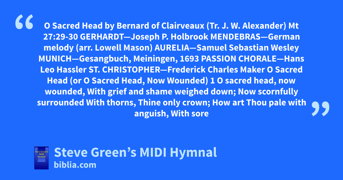 O Sacred Head by Bernard of Clairveaux (Tr. J. W. Alexander) Mt 27:29-30 GERHARDT—Joseph P. Holbrook MENDEBRAS—German melody (arr. Lowell Mason) AURELIA—Samuel Sebastian Wesley MUNICH—Gesangbuch, Meiningen, 1693 PASSION CHORALE—Hans Leo Hassler ST. CHRISTOPHER—Frederick Charles Maker O Sacred Head (or O Sacred Head, Now Wounded) 1 O sacred head, now wounded, With grief and shame weighed down; Now scornfully surrounded With thorns, Thine only crown; How art Thou pale with anguish, With sore