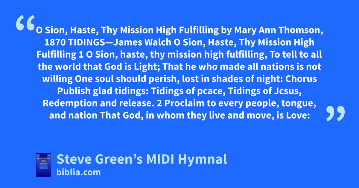 O Sion, Haste, Thy Mission High Fulfilling by Mary Ann Thomson, 1870 TIDINGS—James Walch O Sion, Haste, Thy Mission High Fulfilling 1 O Sion, haste, thy mission high fulfilling, To tell to all the world that God is Light; That he who made all nations is not willing One soul should perish, lost in shades of night: Chorus Publish glad tidings: Tidings of pcace, Tidings of Jcsus, Redemption and release. 2 Proclaim to every people, tongue, and nation That God, in whom they live and move, is Love: