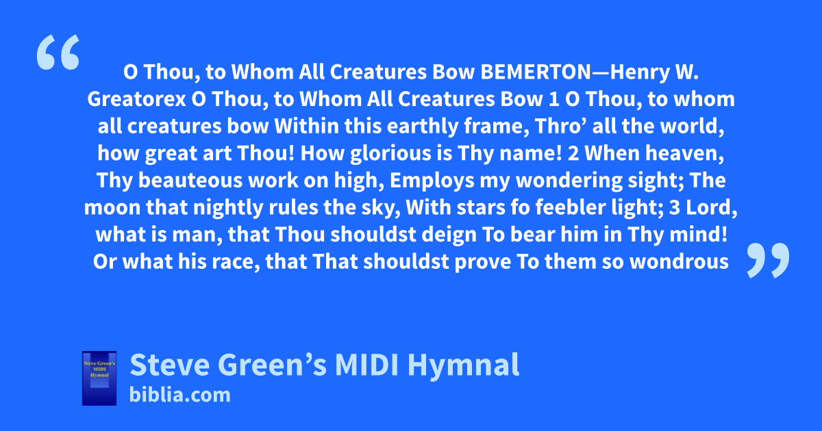 O Thou, to Whom All Creatures Bow BEMERTON—Henry W. Greatorex O Thou, to Whom All Creatures Bow 1 O Thou, to whom all creatures bow Within this earthly frame, Thro’ all the world, how great art Thou! How glorious is Thy name! 2 When heaven, Thy beauteous work on high, Employs my wondering sight; The moon that nightly rules the sky, With stars fo feebler light; 3 Lord, what is man, that Thou shouldst deign To bear him in Thy mind! Or what his race, that That shouldst prove To them so wondrous