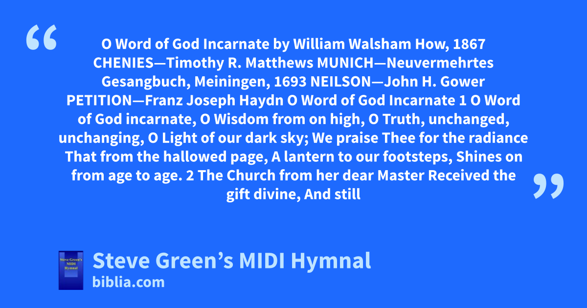 O Word of God Incarnate by William Walsham How, 1867 CHENIES—Timothy R. Matthews MUNICH—Neuvermehrtes Gesangbuch, Meiningen, 1693 NEILSON—John H. Gower PETITION—Franz Joseph Haydn O Word of God Incarnate 1 O Word of God incarnate, O Wisdom from on high, O Truth, unchanged, unchanging, O Light of our dark sky; We praise Thee for the radiance That from the hallowed page, A lantern to our footsteps, Shines on from age to age. 2 The Church from her dear Master Received the gift divine, And still