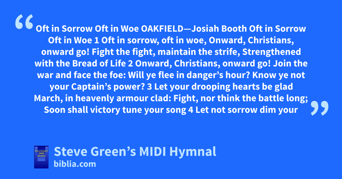 Oft in Sorrow Oft in Woe OAKFIELD—Josiah Booth Oft in Sorrow Oft in Woe 1 Oft in sorrow, oft in woe, Onward, Christians, onward go! Fight the fight, maintain the strife, Strengthened with the Bread of Life 2 Onward, Christians, onward go! Join the war and face the foe: Will ye flee in danger’s hour? Know ye not your Captain’s power? 3 Let your drooping hearts be glad March, in heavenly armour clad: Fight, nor think the battle long; Soon shall victory tune your song 4 Let not sorrow dim your