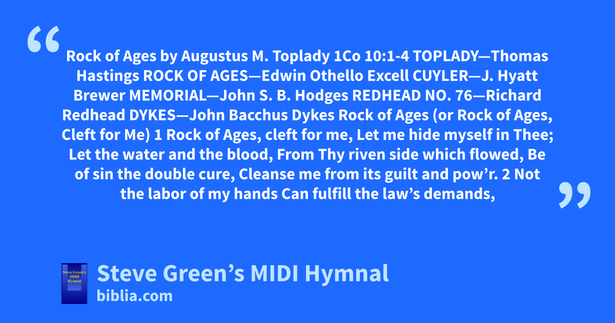 Rock of Ages by Augustus M. Toplady 1Co 10:1-4 TOPLADY—Thomas Hastings ROCK OF AGES—Edwin Othello Excell CUYLER—J. Hyatt Brewer MEMORIAL—John S. B. Hodges REDHEAD NO. 76—Richard Redhead DYKES—John Bacchus Dykes Rock of Ages (or Rock of Ages, Cleft for Me) 1 Rock of Ages, cleft for me, Let me hide myself in Thee; Let the water and the blood, From Thy riven side which flowed, Be of sin the double cure, Cleanse me from its guilt and pow’r. 2 Not the labor of my hands Can fulfill the law’s demands,