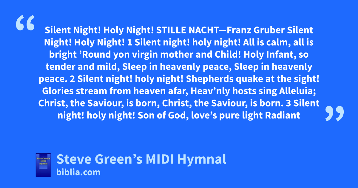 Silent Night! Holy Night! STILLE NACHT—Franz Gruber Silent Night! Holy Night! 1 Silent night! holy night! All is calm, all is bright ’Round yon virgin mother and Child! Holy Infant, so tender and mild, Sleep in heavenly peace, Sleep in heavenly peace. 2 Silent night! holy night! Shepherds quake at the sight! Glories stream from heaven afar, Heav’nly hosts sing Alleluia; Christ, the Saviour, is born, Christ, the Saviour, is born. 3 Silent night! holy night! Son of God, love’s pure light Radiant