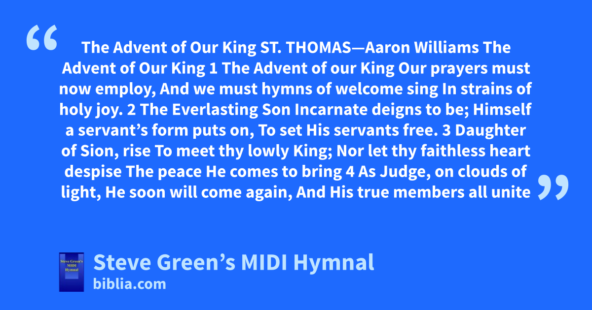 The Advent of Our King ST. THOMAS—Aaron Williams The Advent of Our King 1 The Advent of our King Our prayers must now employ, And we must hymns of welcome sing In strains of holy joy. 2 The Everlasting Son Incarnate deigns to be; Himself a servant’s form puts on, To set His servants free. 3 Daughter of Sion, rise To meet thy lowly King; Nor let thy faithless heart despise The peace He comes to bring 4 As Judge, on clouds of light, He soon will come again, And His true members all unite