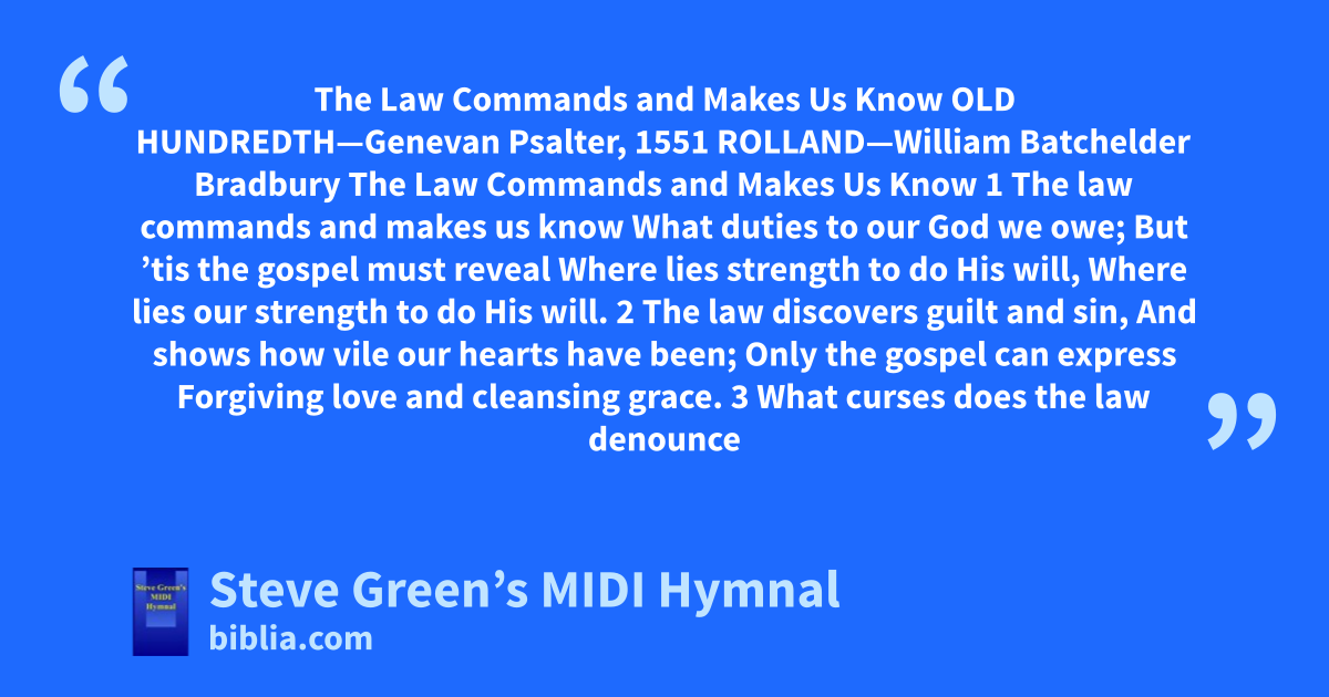 The Law Commands and Makes Us Know OLD HUNDREDTH—Genevan Psalter, 1551 ROLLAND—William Batchelder Bradbury The Law Commands and Makes Us Know 1 The law commands and makes us know What duties to our God we owe; But ’tis the gospel must reveal Where lies strength to do His will, Where lies our strength to do His will. 2 The law discovers guilt and sin, And shows how vile our hearts have been; Only the gospel can express Forgiving love and cleansing grace. 3 What curses does the law denounce