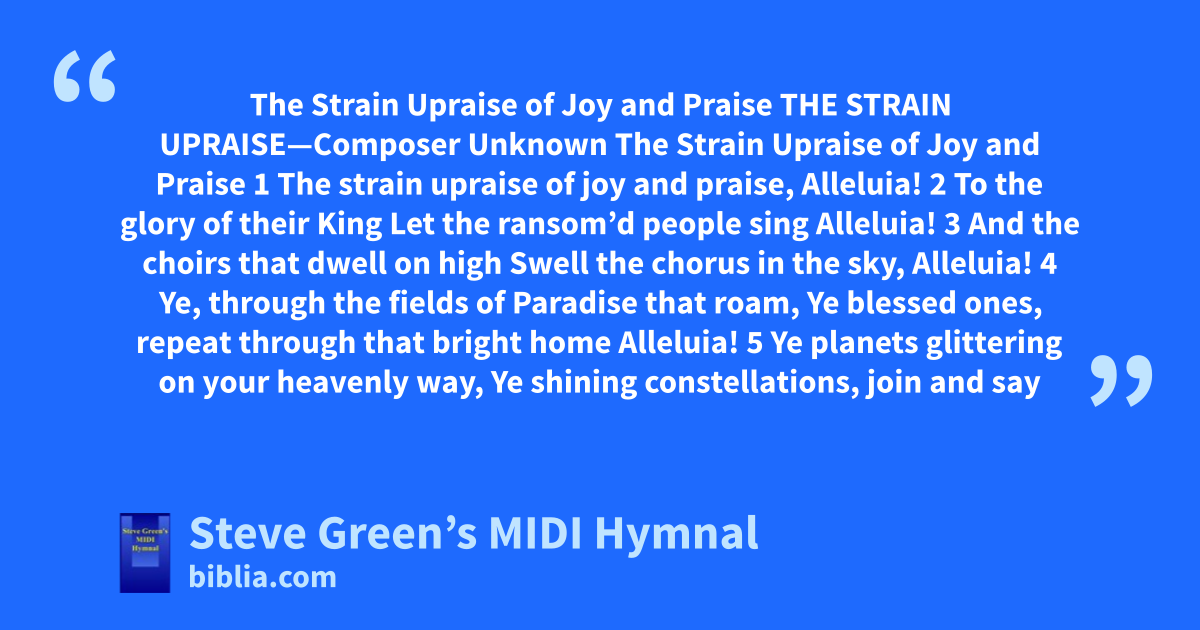 The Strain Upraise of Joy and Praise THE STRAIN UPRAISE—Composer Unknown The Strain Upraise of Joy and Praise 1 The strain upraise of joy and praise, Alleluia! 2 To the glory of their King Let the ransom’d people sing Alleluia! 3 And the choirs that dwell on high Swell the chorus in the sky, Alleluia! 4 Ye, through the fields of Paradise that roam, Ye blessed ones, repeat through that bright home Alleluia! 5 Ye planets glittering on your heavenly way, Ye shining constellations, join and say