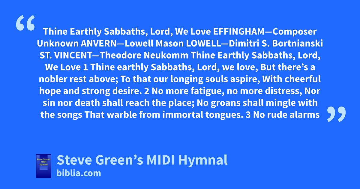 Thine Earthly Sabbaths, Lord, We Love EFFINGHAM—Composer Unknown ANVERN—Lowell Mason LOWELL—Dimitri S. Bortnianski ST. VINCENT—Theodore Neukomm Thine Earthly Sabbaths, Lord, We Love 1 Thine earthly Sabbaths, Lord, we love, But there’s a nobler rest above; To that our longing souls aspire, With cheerful hope and strong desire. 2 No more fatigue, no more distress, Nor sin nor death shall reach the place; No groans shall mingle with the songs That warble from immortal tongues. 3 No rude alarms
