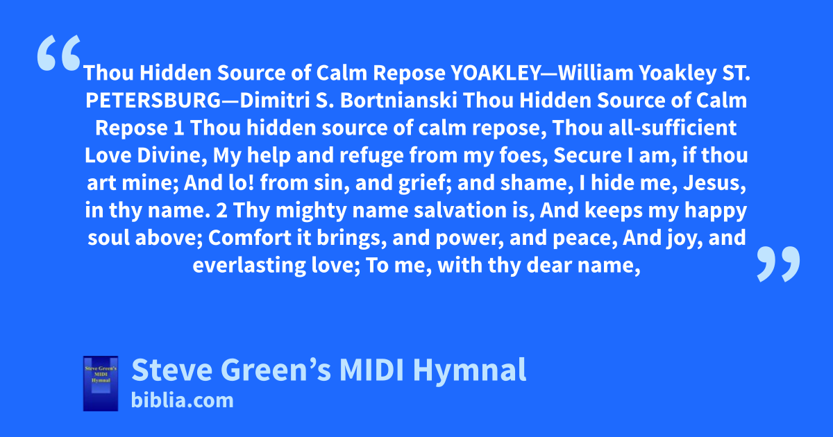 Thou Hidden Source of Calm Repose YOAKLEY—William Yoakley ST. PETERSBURG—Dimitri S. Bortnianski Thou Hidden Source of Calm Repose 1 Thou hidden source of calm repose, Thou all-sufficient Love Divine, My help and refuge from my foes, Secure I am, if thou art mine; And lo! from sin, and grief; and shame, I hide me, Jesus, in thy name. 2 Thy mighty name salvation is, And keeps my happy soul above; Comfort it brings, and power, and peace, And joy, and everlasting love; To me, with thy dear name,